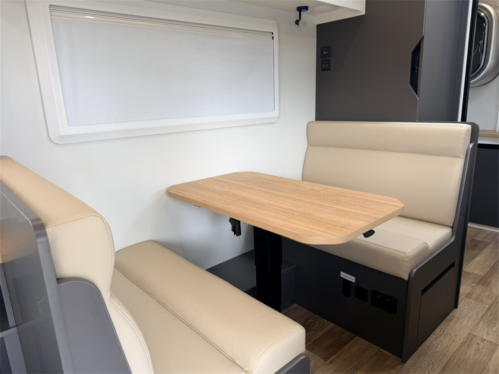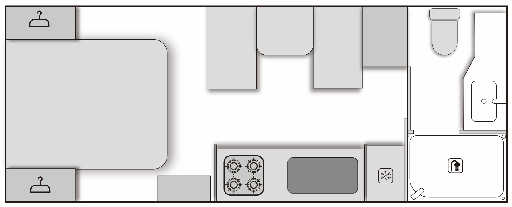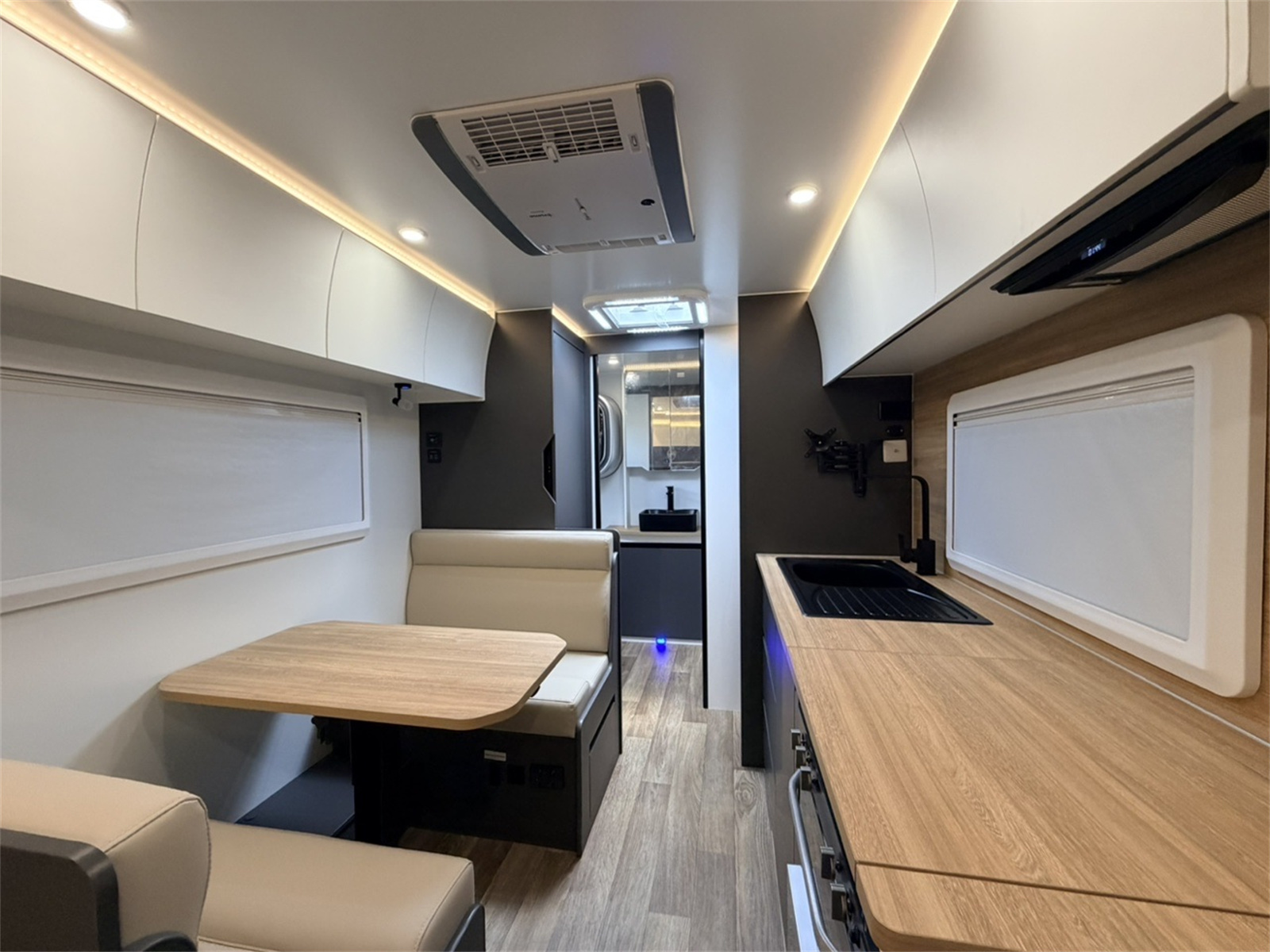 The whole new Venus19 19ft Caravan is thoughtfully designed to enhance your travel experiences with a blend of luxury and practicality. Its contemporary handle-less cabinet design not only offers a modern aesthetic but also prioritizes user safety. Inside, the caravan boasts a well-appointed kitchen equipped with a Thetford Mini Grill featuring four burners, allowing for versatile cooking options during your journeys. The electrical system is robust, featuring a 12V power setup complemented by a 2000W inverter, 400Ah lithium battery, and 600W solar panels, ensuring reliable power supply for all your appliances.