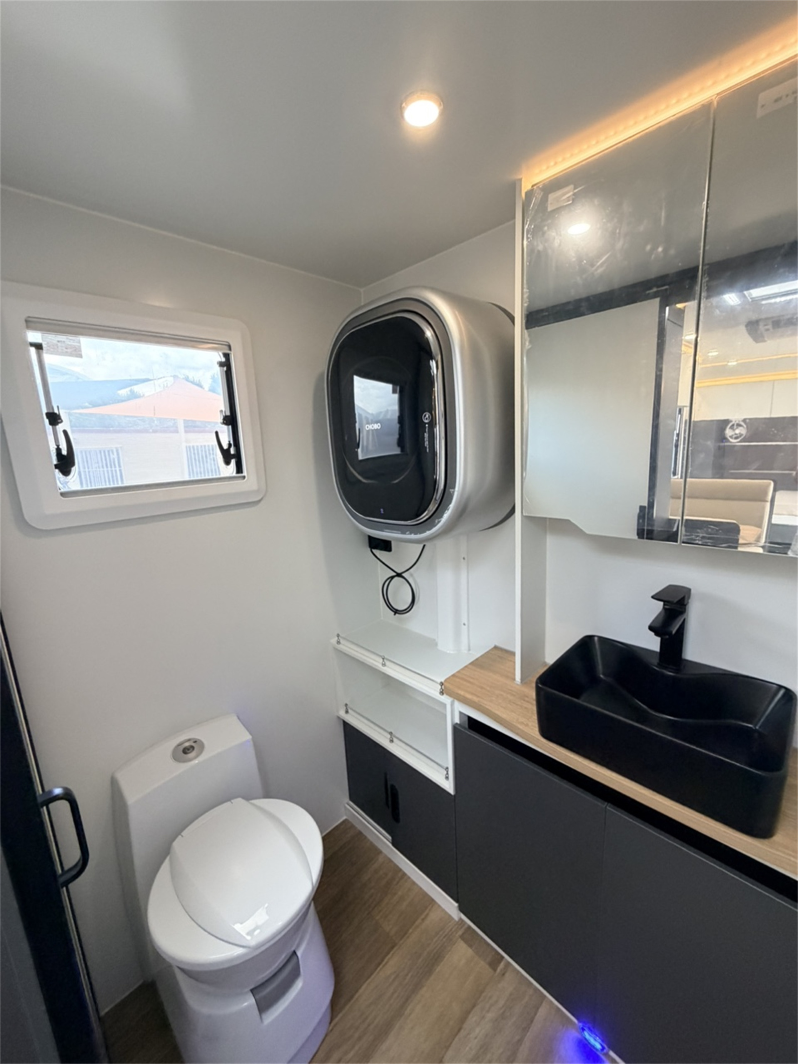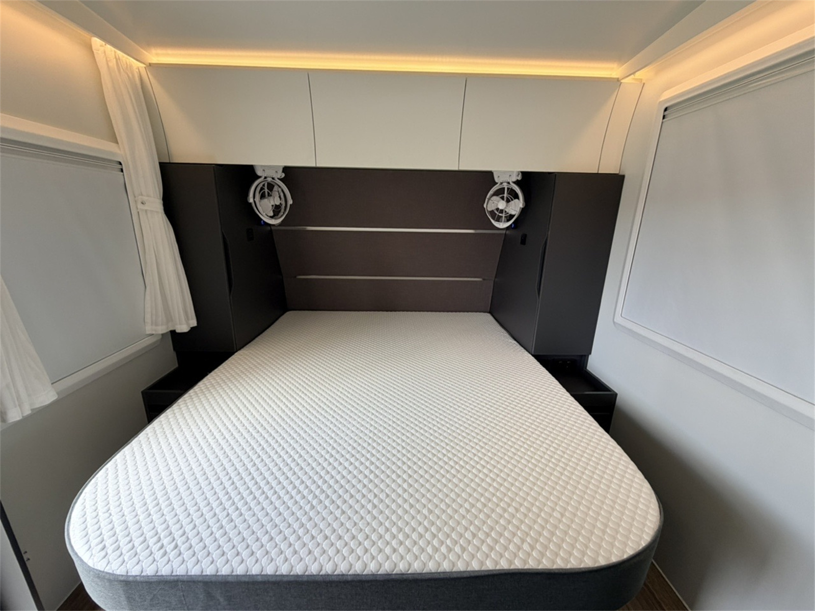 The Venus19 Caravan features an island bed, providing easy access from both sides and enhancing comfort. Its separate toilet design ensures privacy and convenience, allowing multiple users to utilize facilities simultaneously.